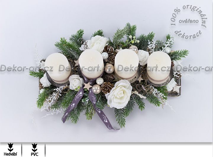 Adventní svícen z šedého proutí, bělený. Svícen ve tvaru oblouku je dekorovaný bílmi růžemi a zimními větvičkami. Kombinace hedvábných a pěnovch květů. Krásné větličky zasněženého smrku s šiškami a přírodní sušenou thilandsií dodávají této adventní dekoraci přírodní krásu.