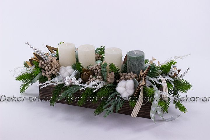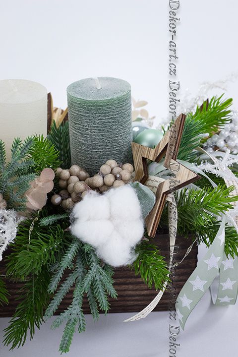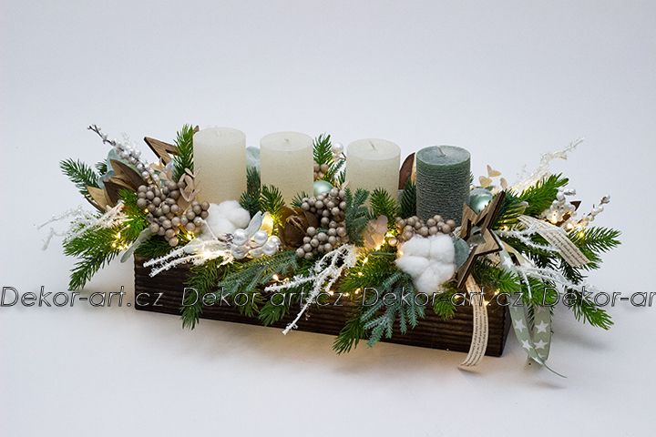 Dekorace umělé smrkové chvojí, doplněné o elegantní kombinaci mint odstínů chvojí a starčeku, které celku dodávají svěží zimní tón. Jemné bobulky, přírodní bavlník a nádherná indická sušina květu Lily přinášejí dekoraci exotičtější dotek, přitom však zůstávají harmonicky propojené s přírodním vzhledem celku. Aranžmá dále zjemňují krémové větvičky eukalyptu, bílé ledové větvičky a decentní skleněné ozdoby, které podtrhují adventní atmosféru.