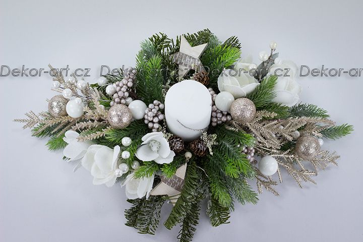 Elegantní vánoční svícen v kombinaci bílé a šampaň přináší čistotu, jednoduchost a luxusní vzhled. Dominantou je bílá svíce s imitací zirkonu na bezpečnostním kovovém bodci. Aranžmá tvoří umělé smrkové a cedrové větvičky, krémové vřesy, bílé a šampaň bobulky a ozdoby ze skla a PVC s jemnými glitry. Součástí je LED osvětlení s časovačem pro kouzelnou vánoční atmosféru. Ideální jako velký svícen na sváteční tabuli.