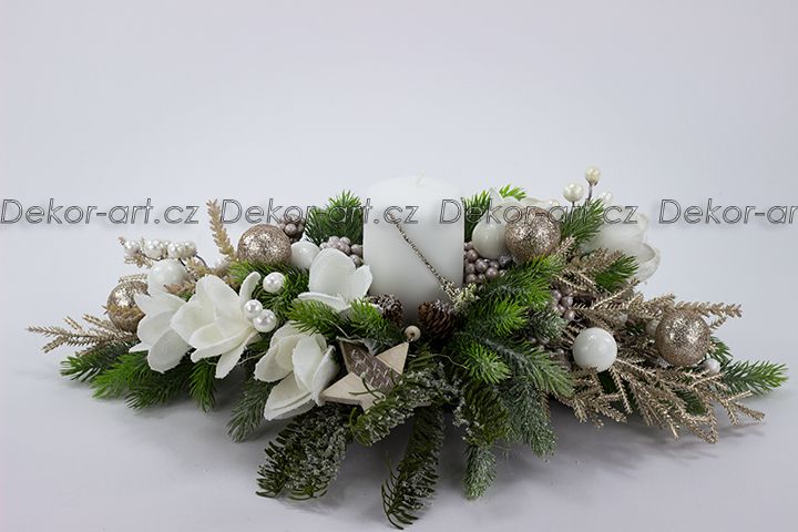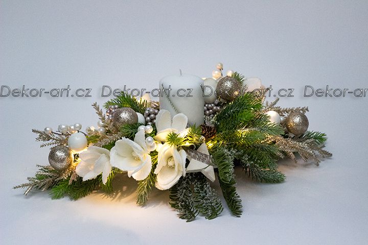 - bílé zasněžené květy magnolie, materiál hedvábí, umělé smrkové chvojí a doplňky