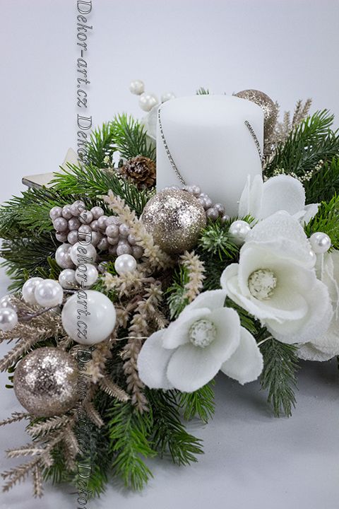 Vánoční elegance, vánoční svícen v odstínech bílé a šampaň dokonale doplní moderní i klasický interiér. Dominantou dekorace je bílá svíce s imitací zirkonu, umístěná na bezpečnostním kovovém bodci pro stabilní a bezpečné použití. Krásné květy bílé zasněžené magnolie z hedvábí, dodává dekoraci zasněžený vzhled.