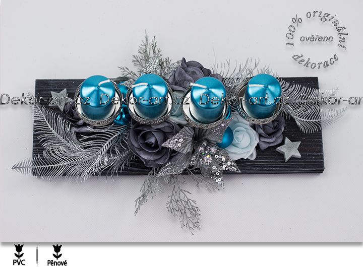 Nadčasový adventní svícen na strukturovaném šedém dřevě s okrasnými bodci. Moderní kombinace šedých a tyrkysových růží z pěny, sametový květ vánoční hvězdy. Stříbrné kapradí které svícnu dodává nadčasovost.