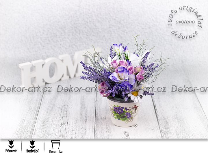 Letní dekorace plná lučního kvítí v krásném keramickém květináči s nápisy. Hedvábné květy fialové eustomy, růžiček a kopretin aranžované společně s umělou levandulí a šedou trávou. Vneste si domů kousek letní louky plné lučního kvítí s krásným bílým motýlkem.