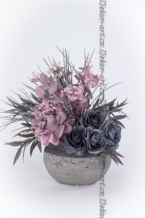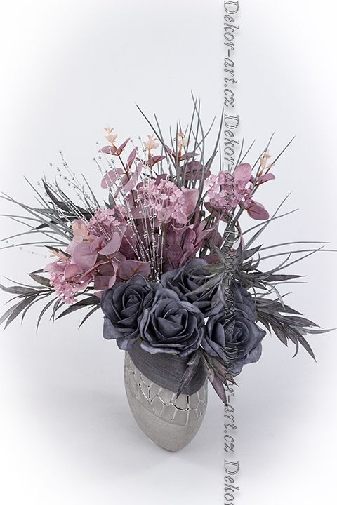 Designová váza s drásaným efektem v šedostříbrném provedení doplněná velkými šedými růžemi, starorůžovými hortenziemi a stříbrným dekoračním drátem. Moderní minimalistická dekorace s možností jemné úpravy tvaru.