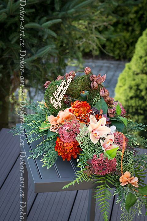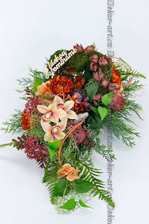 Dekorační ikebana na hrob v podobě mechového srdce s dřevěným nápisem „S láskou vzpomínáme“ působí důstojně a elegantně, je dominantou aranžmá. Oranžové odstíny hedvábných chryzantém krásně ladí s květy orchideje cymbidium a physalisem. Bordó květy česneku aranžmá ozvláštňuje a vytváří kontrast k podzimním odstínům. Umělé thuje a kapradí dodávají přirozený vzhled, zatímco dekorační stuha a pedig podtrhují celkový charakter dekorace. Tato ikebana je vhodná jako pietní výzdoba hrobu v období dušiček i během celého roku.