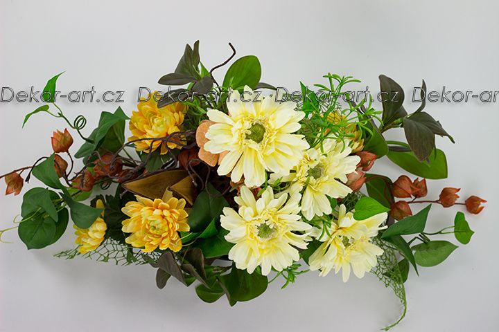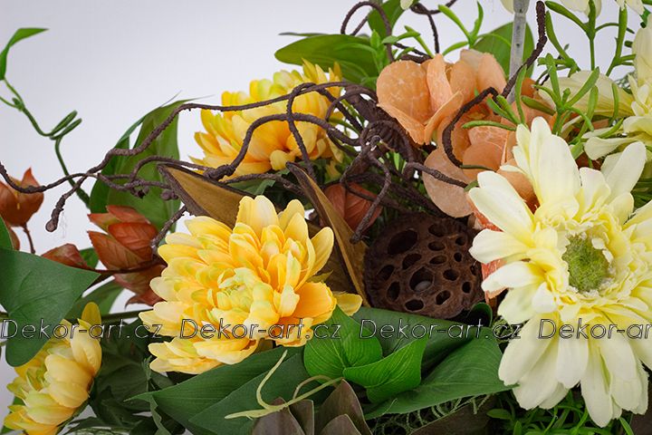 - hedvábné květy chryzantém a gerber, umelá zeleň, kroucené větvičky, umělá podzimní větvička physalisu, sušina