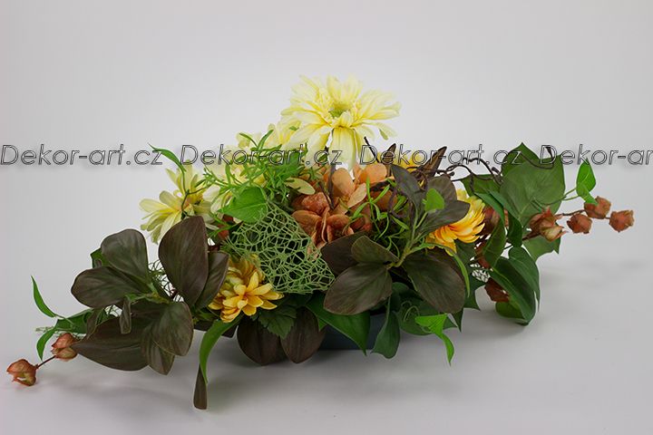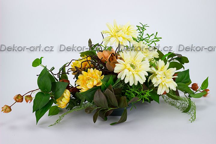 Dušičková miska v jemných podzimních barvách. Kombinace světle žluté gerbery a tmavě žluté chryzantémy s podzimními větvičkami a přírodními doplňky. Bohatě zdobená ikebana s hnědým krouceným proutím a zelení. Sušina v podobě hnědého lotosu a sušiny, zelený asparágus dodávají aranžmá harmonii spoli s podzimními listy. Kontrast květů hedvábných hortenzií. Ideální dekorace k pietnímu okamžiku nebo k ozdobení hrobu, dušičková výzdoba.