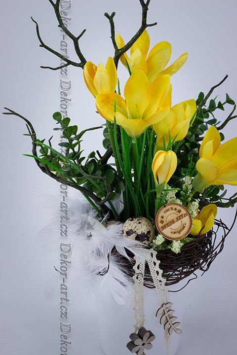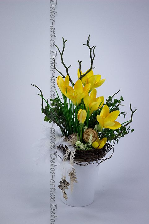 Jarní dekorace s keramickým květináčem, žlutými krokusy a jarními detaily přináší do vašeho domova moderní a nadčasovou atmosféru jara. Kombinace hedvábných květin, proutí, umělých vajíček a jemných doplňků vytváří dekoraci, která zaujme na první pohled a potěší svou krásou celé jaro.