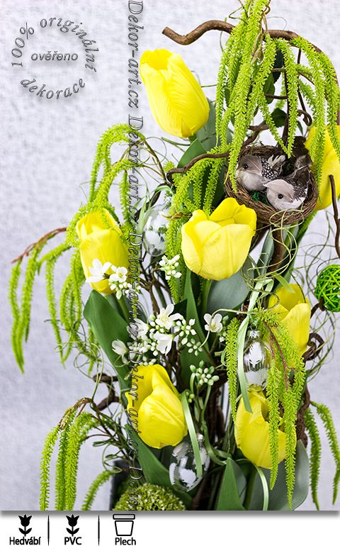 Jarní dekorace s kroucenou vrbou a velkými žlutými tulipány