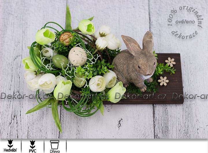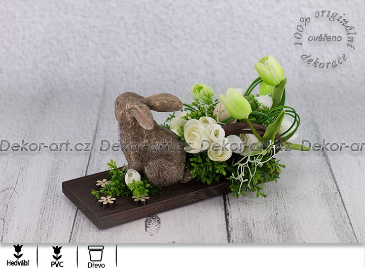 Dekorace s roztomilým velikonočním zajíčkem aranžovaná na strukturovaném dřevě s patinou. Roztomilý zajíček sedící v jarním záhonku s tulipány a poupaty drobných ranunculusů. Krásná dekorace s jarními květy, vajíčky vás bude těšit od jara až do Velikonoc.