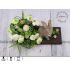 - bílé hedvábné květy ranunculusu, umělá zeleň - buxus, dracena, aranžérský mech, kombinace hnědého a přírodního pedigu, dřevěné kvítky