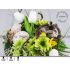 - bílé pěnové tulipány, hedvábné květy žlutých krokusů a zelené chryzantémy, thilandsie, dracena, umělé tvarovací větve vrby, sušená tráva