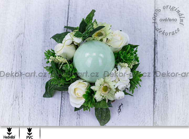 Krásná velikonoční dekorace na stůl, plná rozkvetlých květů. Velikonoční keramické vajíčko v zeleném odstínu obklopené květy mýdlových růží, hedvábných květů gerber a bílých ranunculusů. Celé aranžmá je dekorováno na dřevěném plátu břízy. Nadčasová dekorace s krásnými květy vnese do vašeho domova jaro.