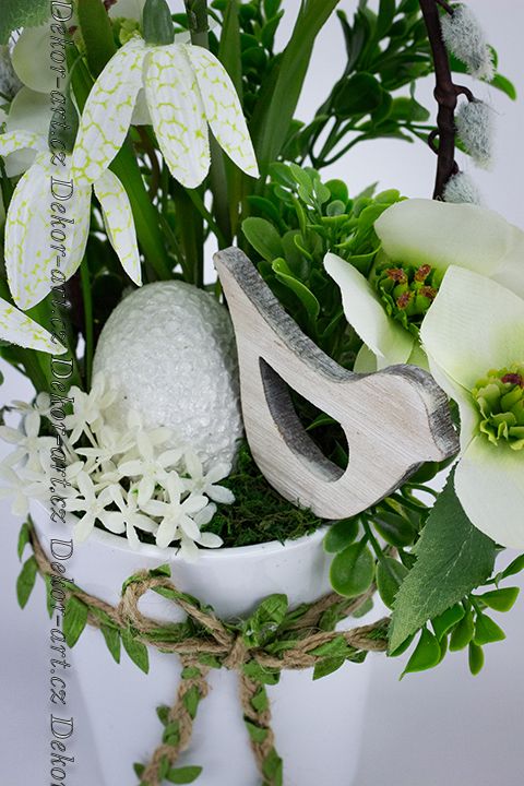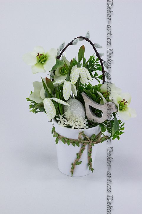 Svěží vzhled dodává umělý buxus, sušený mech, bílé vajíčko s dekorem drobných kvítků, které je položeno v mechu a obklopeno drobnými bílými kvítky. Dřevěný ptáček, který aranžmá dodává lehkost a jarní symboliku.