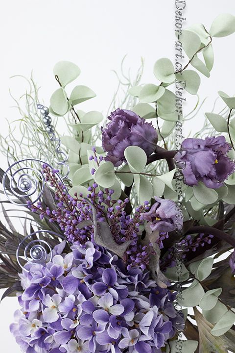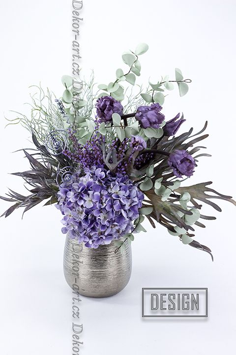 Dominantou aranžmá jsou top latexové tulipány v matném tmavě fialovém odstínu, doplněné o šedou dracenu, parožnatku, bělnou tilandsii a hedvábnou hortenzii. Moderní, nadčasová jarní dekorace, dle nejnovějších trendů do stylového interiéru. Jemný detail v podobě fialového aranžérského drátu s dekorativními šedými perlami - bižuterie, originální doplněk. Vše je pevně svázáno do hotové kytice – stačí pouze vložit do designové vázy.