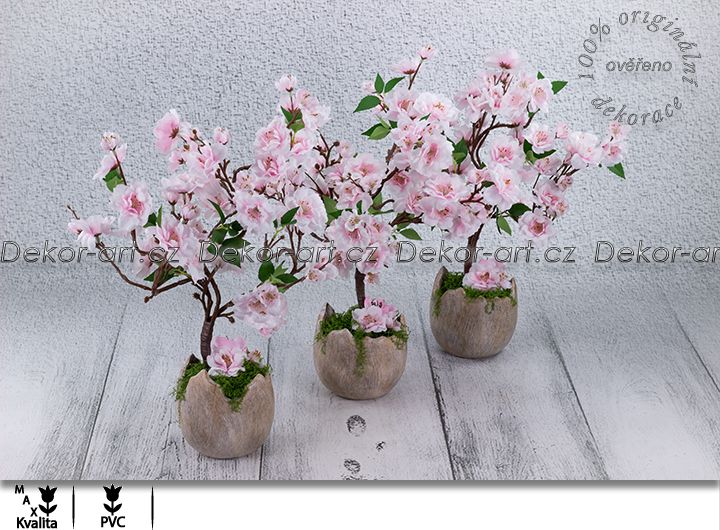 Růžové květy jabloní v jarní skořápce. Minimalistická dekorace s krásnými růžovými květy, ve tvaru rozkvetlého stromu. Krásná jarní skořápka s imitací mechu. Nechte se okouzlit rozkvetlou jarní přírodou.