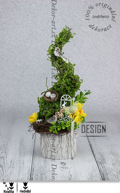 Vneste si jaro do svých domovů, netradiční dekorací svěží zelené túje ve tvaru spirály a žlutých hedvábnch krokusů. Dekorace v moderním stylu v krásném květináči s dekorem břízy.