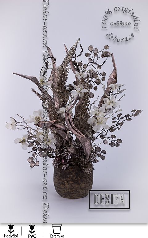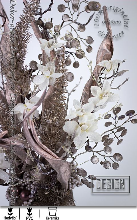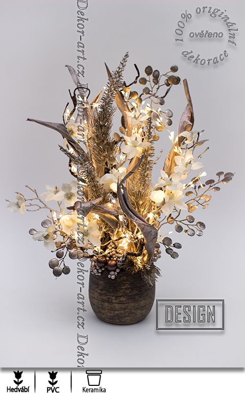 Luxusní vánoční dekorace s krásnou sušinou a květy magnolií v odstínech champagne. Dekorace plná designových větviček a krásné tropické sušiny. Nadčasový design letošních vánoc. Krásné krémové odstíny zasněžených magnolií. dekorace aranžována do stylového květináče s antickým vzhledem. LED dekorační větvička která dodává této dekoraci vánoční atmosféru a luxusní vzhled. Dekorace do stylového, moderního interiéru.