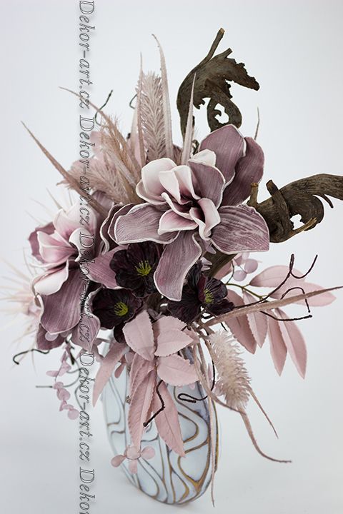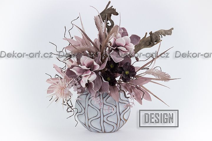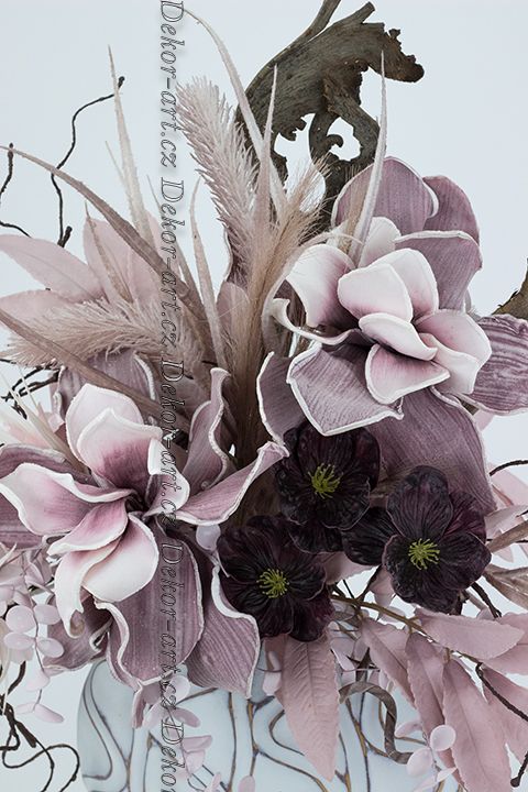 Doplňují je drobné latexové květy čemeřic v matném bordó odstínu, jemné růžové tóny pěnových eukalyptů, hedvábné květy a listy vavřínu – starorůžové odstíny, umělá pampová tráva. Hnědá tvarující větev imitace spolu s tropickou sušina „losí rohy“ – volně k dekorování dle vlastní fantazie, dodávají kousek přírody do vašeho domova.