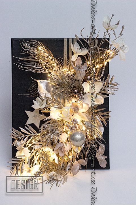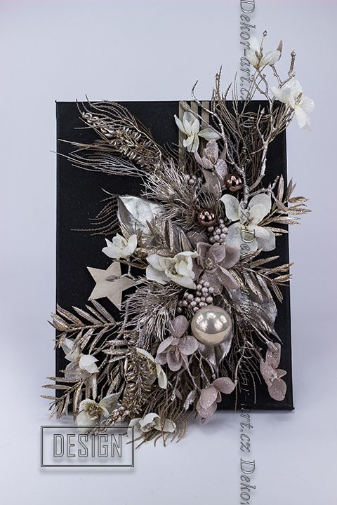 - obraz - černé plátno, dekorováno stuhou, vánočními květy a brokátovými vánočními větvičkami, šedými podzimními větvičkami v matném odstínu, rozměr plátna - výška 1,5 cm x 40 cm x 30 cm