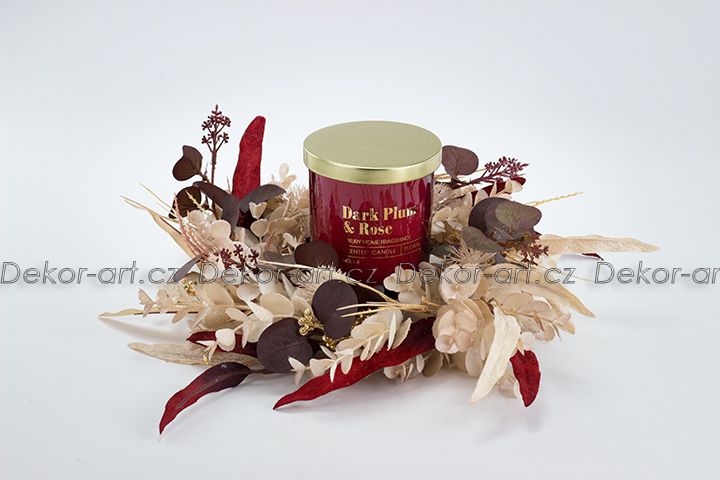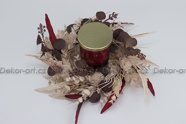 Designový podzimní svícen v elegantním stylu, do moderního interiéru kombinuje přírodní eukalyptové větvičky v odstínech krémová, podzimní bordó a zlaté odstíny.