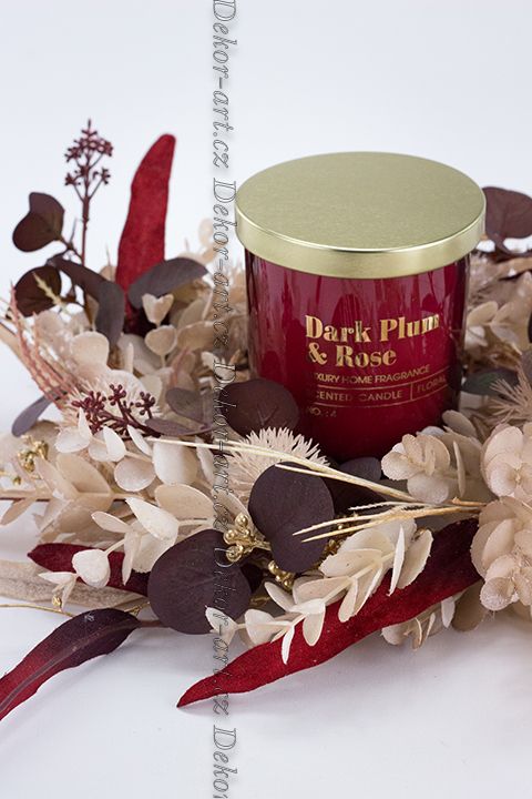 Červené sklo vonné svíčky se zlatým víčkem dodává dekoraci sofistikovaný vzhled, zatímco dekorační věneček kolem svíčky vytváří harmonický a teplý dojem.