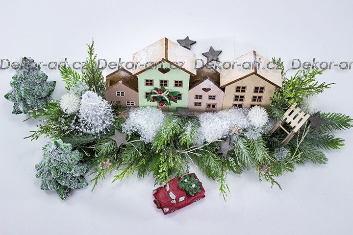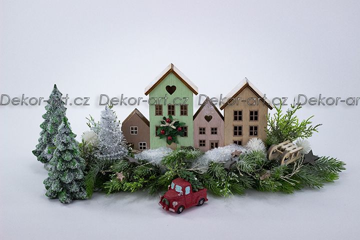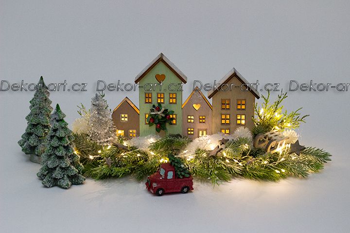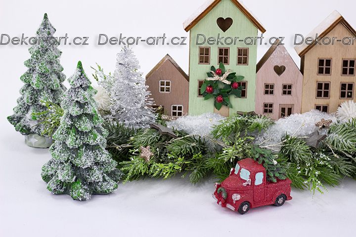 Vytvořte si doma kouzelnou zimní atmosféru s detailně zpracovaným vánočním městečkem. Součástí dekorace jsou dřevěné domky se zasněženými střechami, bílé i zelené zasněžené stromky, umělé chvojí doplněné ledovými vločkami a stylové červené autíčko s vánočním stromečkem. Zelené stromky a vánoční auto lze libovolně rozestavit a dotvořit podle vlastní fantazie, dodáno volně.