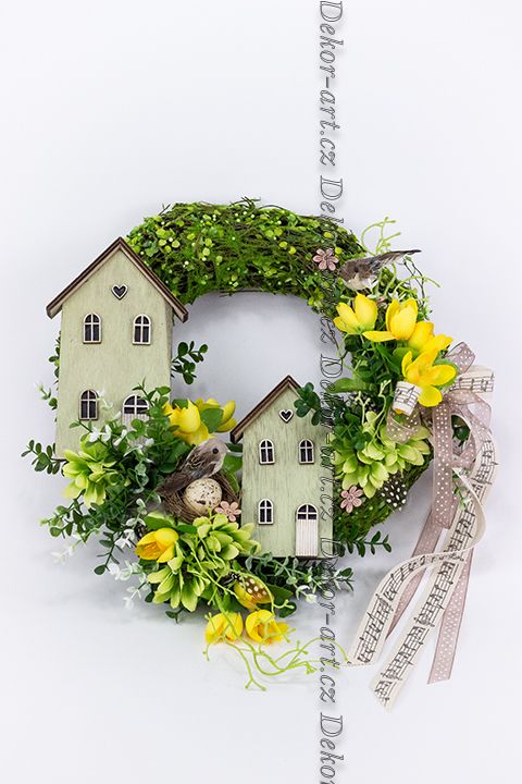 Jarní věnec s krásnými domečky v zeleném odstínu. Žluté hedvábné krokusy a jarní detaily. Proutěný korpus zdobí umělý buxus, kvetoucí větvičky, ptačí hnízdo s vajíčkem a dvojice ptáčků. Věnec je doplněn krásnou stuhou s notami, kterou lze po odvázání libovolně aranžovat. Ideální jarní i velikonoční dekorace, která vnese do vašeho domova atmosféru probouzející se přírody.