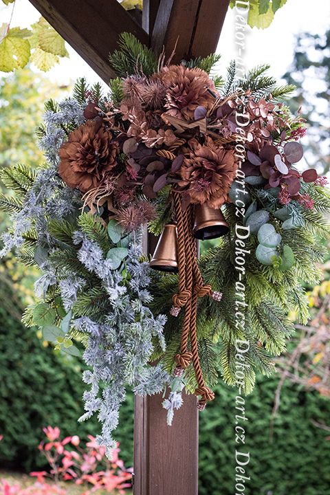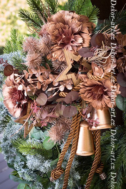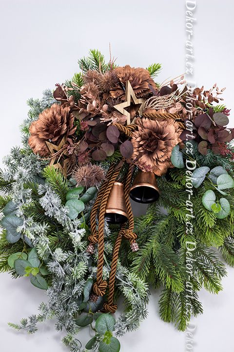 - slaměný základ obalovaný, umělá jedle, cedr, hedvábné eukalypty, péřové květy v odstínu Cooper