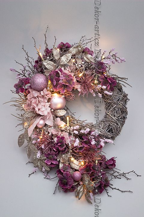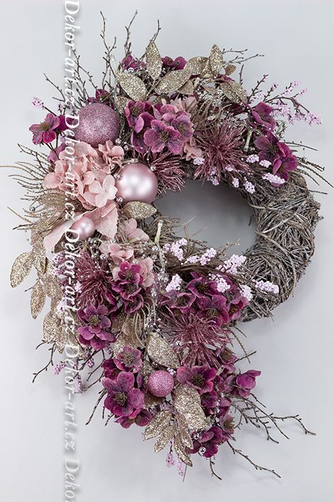 Vánoční kouzlo jemné elegance s věncem z běleného proutí . Krásné odstíny a světle růžové a magenta. Věnec zdobí hedvábné zasněžené hortenzie, ledové květy třešní a brokátové listy v pudrově růžovém tónu. Věnec zdobí hnědé ojíněné a podzimní větvičky, které vytvářejí přirozený kontrast.